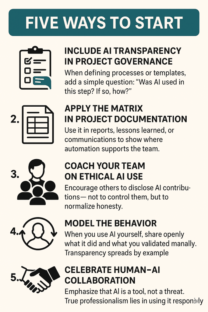 Just as we manage scope, risk, and change, we must now learn to manage AI ethics and transparency — not because someone tells us to, but because our leadership credibility depends on it.If we want to earn the trust of stakeholders, sponsors, and teams, we must show that technology doesn’t replace judgment — it enhances responsibility.When we show integrity in how we use AI, we set a new standard for others to follow.To make this principle practical, I propose the AI Engagement Transparency Matrix. It helps professionals clearly document which parts of their work are performed by humans and which are supported by AI.
