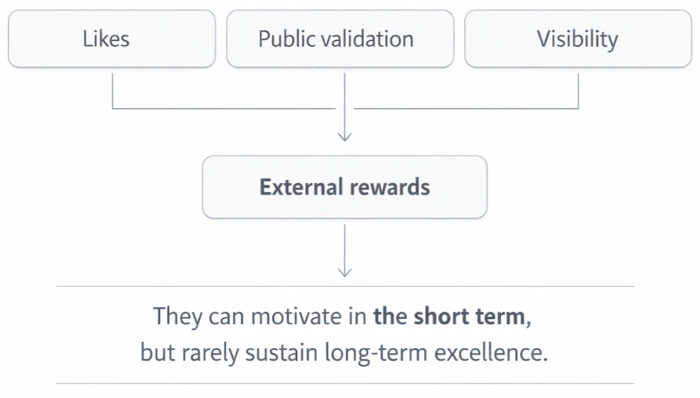 Another very interesting framework is the Self-Determination Theory developed by Edward Deci and Richard Ryan. This was also a domain where I had little knowledge before exploring it. Their research shows that sustainable motivation depends on autonomy, competence, and relatedness. When behavior is driven mainly by external rewards — approval, recognition, applause — intrinsic motivation decreases.